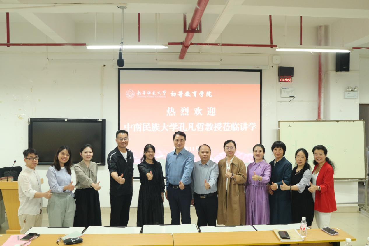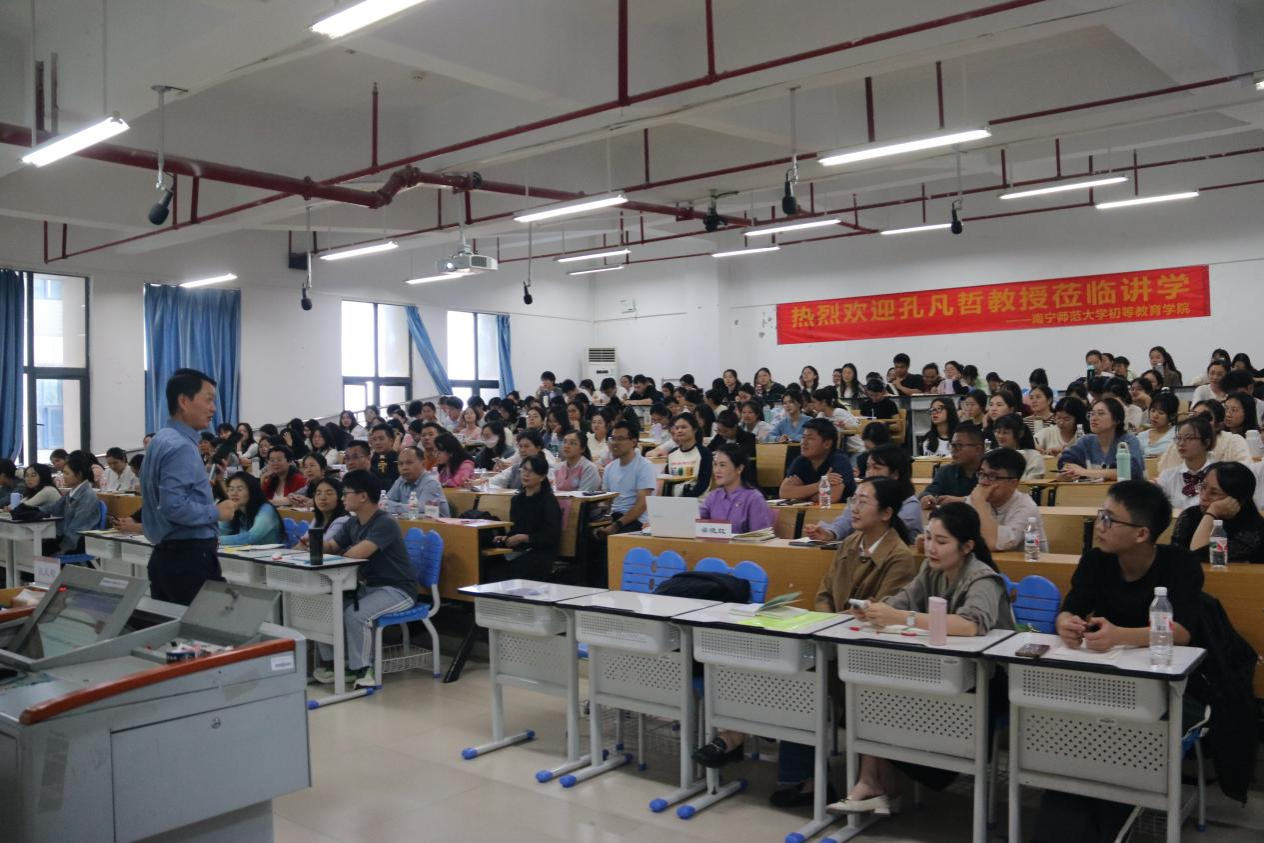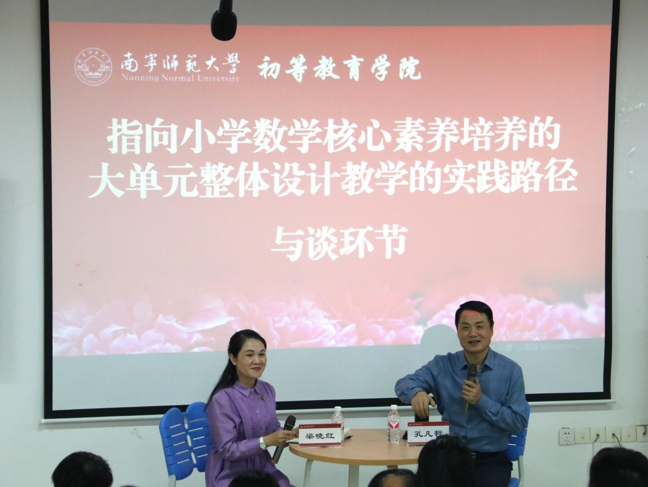 孔凡哲教授是义务教育阶段国家数学课程标准研制组核心成员,熟知学生核心素养和数学课程改革的国内外前沿动态,对当前小学数学课程教学改革有着丰富的研究经历与学术视野。讲座中,孔教授巧妙融入个人丰富的教育故事,系统阐述了小学数学单元整体教学的核心理念、研究脉络、主要类型及其教育价值,特别选取“比与比例”作为教学实例,生动展示如何在实际教学中落实核心素养导向的单元整体教学设计策略。活动设置了与谈环节和互动环节。在与谈环节,我院教授、全国模范教师、广西特级教师梁晓红老师,就小学数学单元整体教学的实施、新教材的使用以及师范生综合素养提升等话题,与孔教授展开了深入而富有启发性的交流;在互动环节,孔教授围绕在座的师范生和小学教育工作者如何提升个人核心竞争力,分享了多条宝贵建议。讲座在学院荣退教师、广西民办教育协会法人代表兼秘书长陈寿强的精彩致辞中落下帷幕。