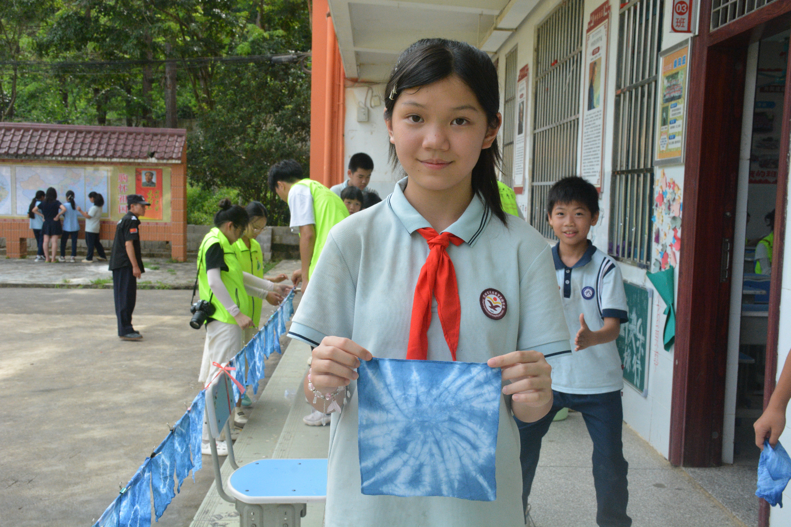 7月18日,必赢3003no1线路检测中心“南疆育苗”实践队在凭祥市民族希望实验学校开展了一场别开生面的“童言绘边关,巧手传国韵”爱国主义教育活动。活动通过非遗扎染体验与书画创作结合的形式,让边疆儿童在文化浸润中厚植家国情怀。