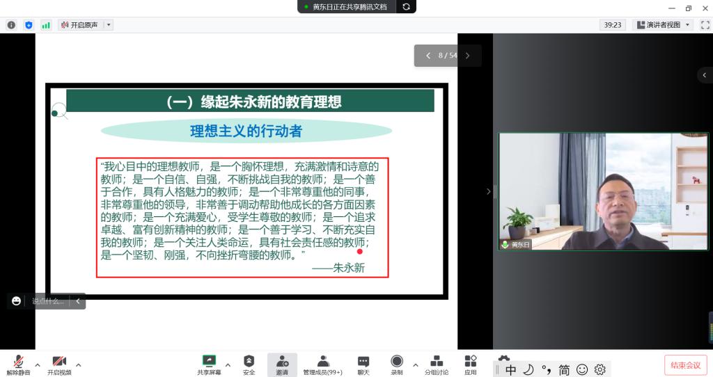 校友黄东日的讲座内容主要围绕“新教育实验的发起与兴盛”和“新教育实验与教师的成长”两大主题展开,通过解读朱永新教授关于新教育实验的理论观点,介绍了新教育实验由发起到兴盛的20多年历程,以及新教育实验的主要特征、使命、愿景、价值观、“十大行动”、成功与收获等,指出新教育实验顺应了中国基础教育变革的客观要求,为教师提供了“过一种幸福完整的教育生活”的可能,唤起了教师的职业认同,助力教师专业成长。讲座最后,校友黄东日勉励学弟学妹们只争朝夕,不负韶华,用心书写好自己的教师生命传奇。